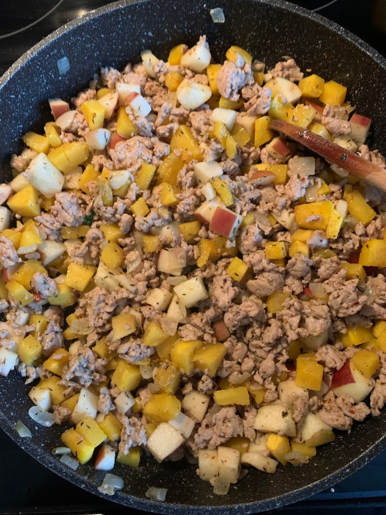 - Add ground chicken, all of the spices and stir. Note – I don’t measure my spices, just eyeball it and add as you prefer.