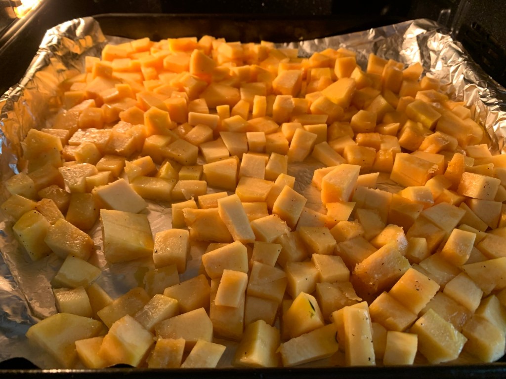 - Add diced squash to a baking sheet and toss with olive oil, salt and pepper. Bake at 350F for 20 minutes.