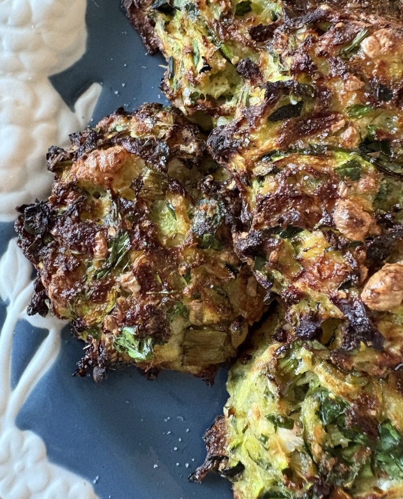 - Scoop your mücver mixture with a spoon into the air fryer and slightly flatten. Bake at 350 for 12 mins.